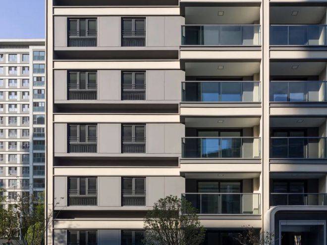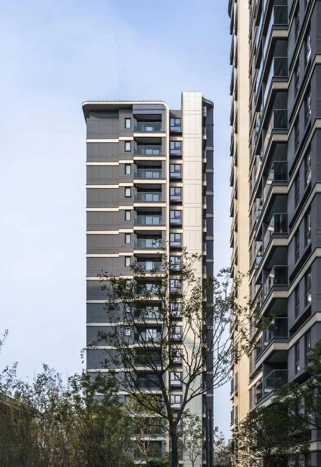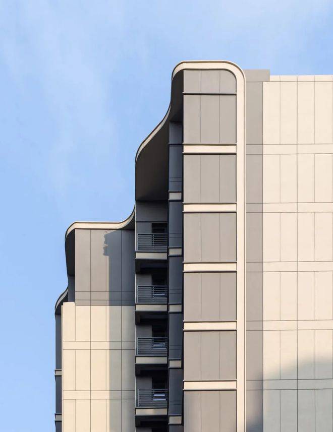 横向金属线条以精确的模数延展,在立面上切割出优雅的节奏,赋予建筑流动的韵律感。