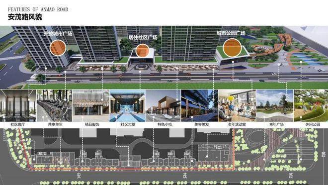 以"城市针灸"理念重塑安茂路街道基因,打造全时态商业配套界面,通过3组口袋广场与建筑内退策略的耦合设计,打造"15分钟活力磁场",激活街道活力。