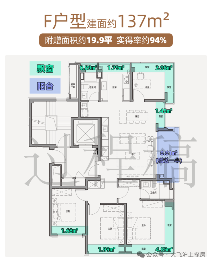 全屋7飘窗+半封阳台,赠送面积近20㎡,实得率约94%。