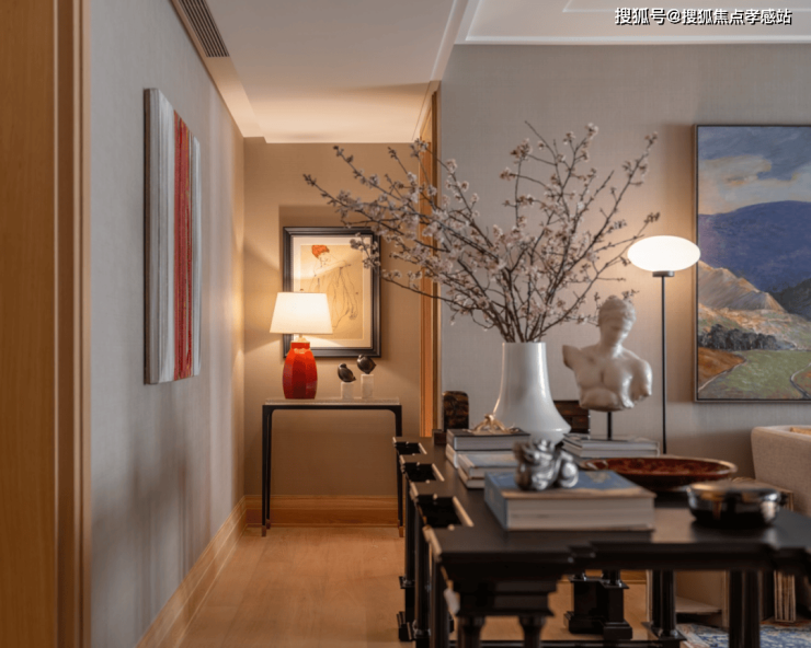 玄关是空间过渡的前站,是外部世界与私人领域之间的节奏转换地。通过材质、肌理、色调的搭配组合,构建具有电影质感的归家场景。作为空间的重要组成部分,艺术品恰如其分地妆点其中,让主人的风雅志趣一眼可见。