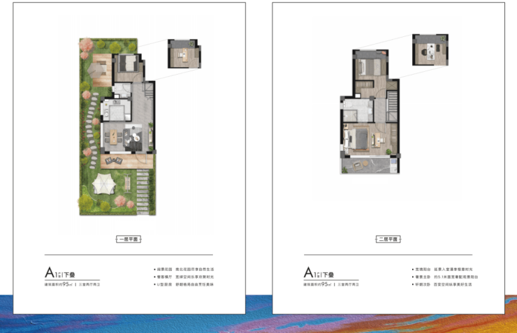 项目户型方面,面积段有两种——建面约95㎡下叠、上叠;建面约150㎡下叠、上叠。