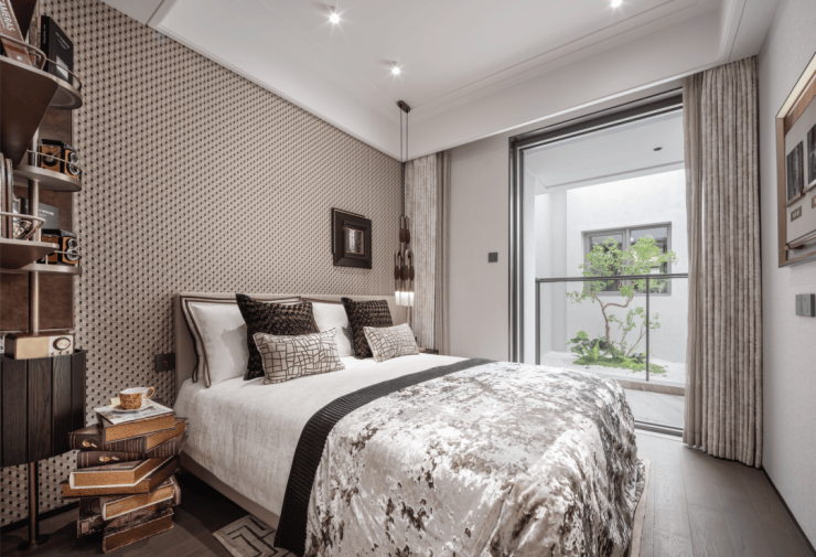 外立面上,参考了新加坡的豪宅如nassim road的立面设计,采用大面玻璃,增加金属格栅+铝材搭配,融合学府灰高级配色,呈现学府灰与玫瑰金辉映的宝格丽高奢风格。