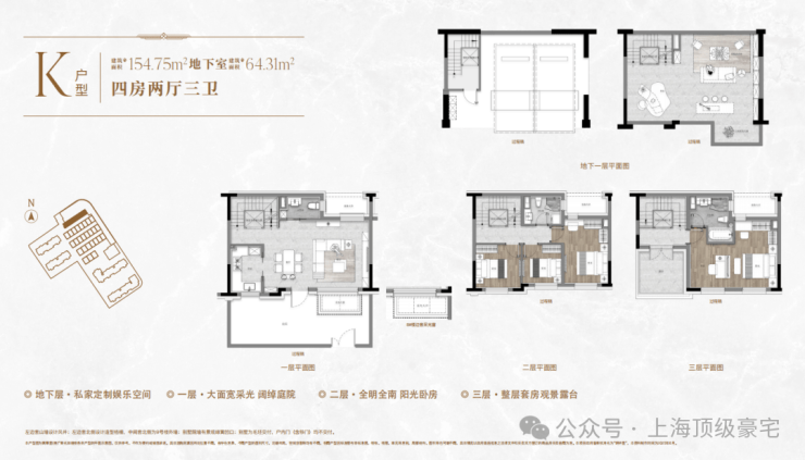 一楼和地下室主社交和志趣,二楼是子女的房间,三楼是主人休憩区。