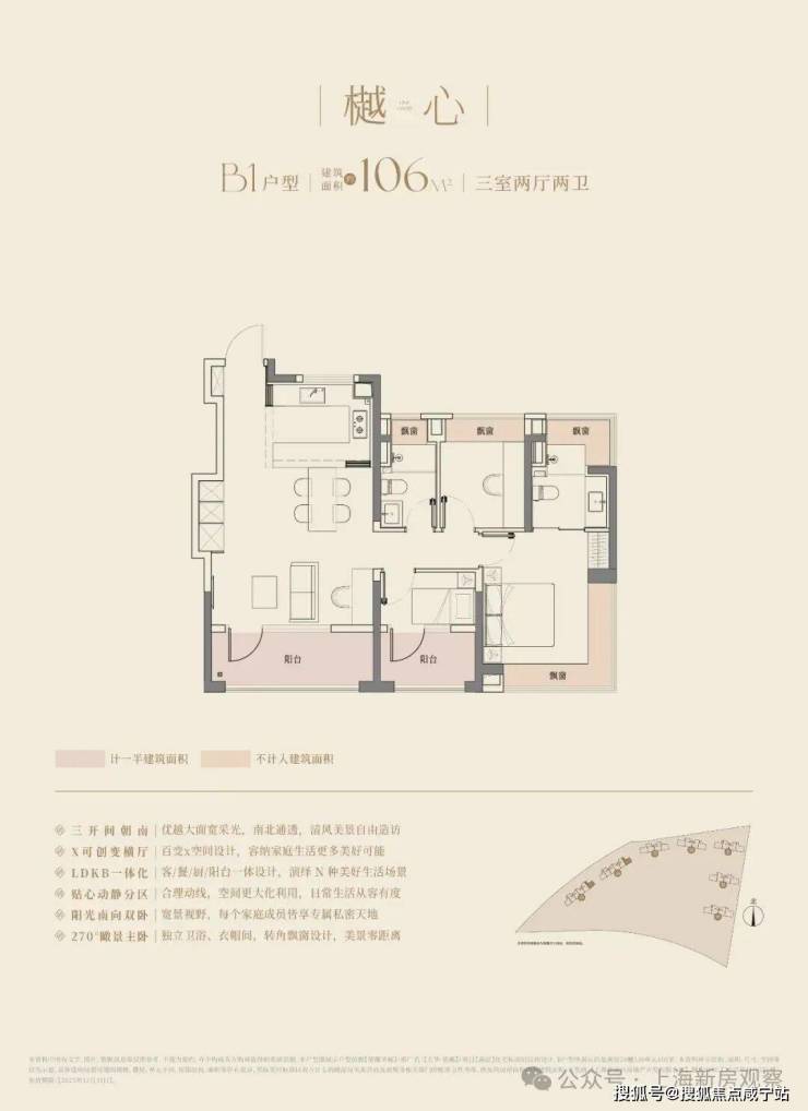建筑面积约106㎡户型,更是以宽尺大横厅和270°的转角飘窗赚足了眼球,阳光与清风自由流淌,居住舒适度全面提升。LDKB一体化设计,在餐厨区布局万能中岛台,打破了厨房与餐厅的界限,延伸烹饪空间,增加收纳空间,更将社交功能融入其中,重塑中国人的情感场域。