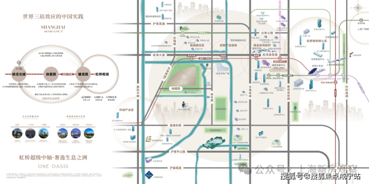 交通当面,项目北侧紧邻17号线徐泾北城站(需绕行河道),1站可达徐盈路天空万科广场,2站至蟠龙古镇商业区,3站直达国家会展中心,4站即达虹桥枢纽。