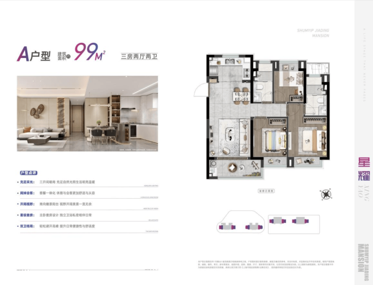 深嘉上府以88-99㎡的明星爆款小户型,圆年轻人的置业梦想。其中,88㎡户型以三房两厅一卫的格局,兼具功能性与尺度感。南向三开间,做到两间卧室朝南,这样的面宽,媲美市面上100㎡户型的新房尺度。u字形的厨房,动线合理。餐厅空间,能够从容摆放一张四人大餐桌。全屋飘窗设计,将赠送空间拉满。