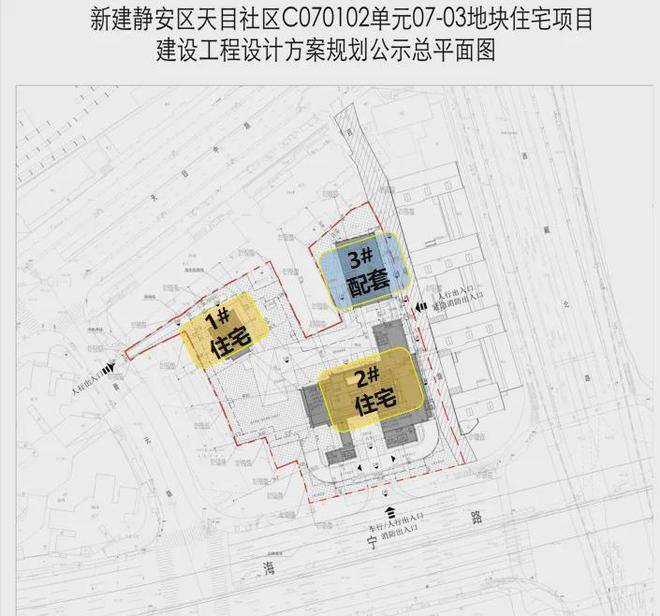 小区内基本实现了人车分流,地块有3处人行出入口,分别为西北角的晋元路(人行出入口)、南侧海宁路(人行/车行/消防出入口)、东侧百禄路(人行/紧急消防出入口)。