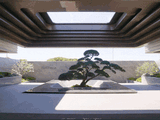 下沉庭院整体长约18米,进深约9.5米,庭院的上下景观通过水帘相连通,中间结合有着层层叠水的水景,搭配水晶砖的景墙,将品质感拉满。