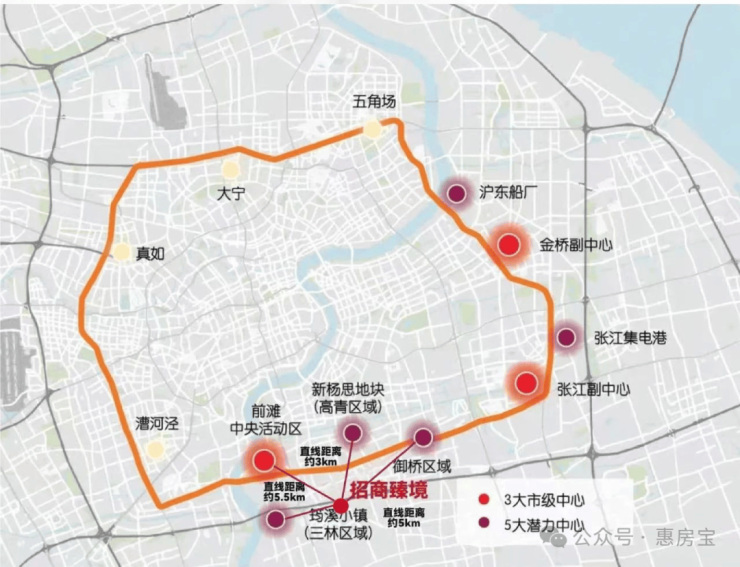 而以前滩、世博为中心,画三个直线约5-7km的生活圈,招商臻境是唯一一个约600万起的新房,而其他的选择,总价起码千万起。