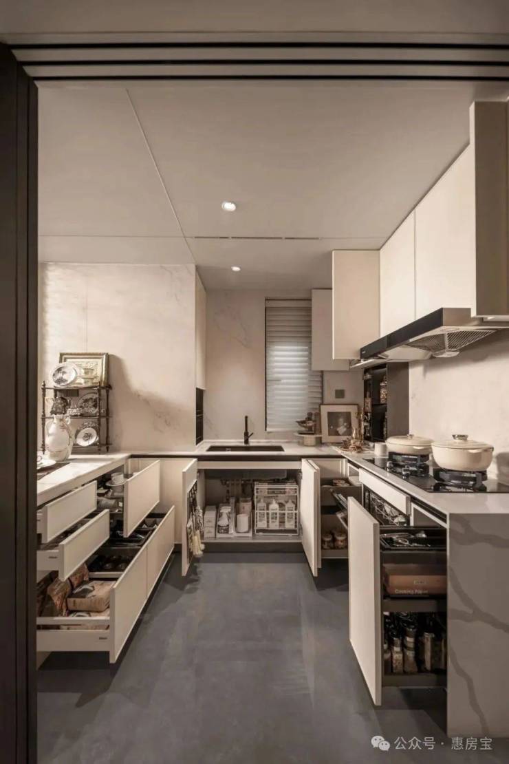 厨房更是收纳主场,设置了多功能调味拉篮、定制谷物抽屉,让瓶罐各归其位,烹饪时少了琐碎,多了诗意。