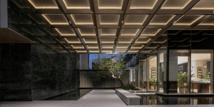 约200平左右的归家大堂做了书吧、落客区、咖啡吧,颇有现代摩登风格的感觉。