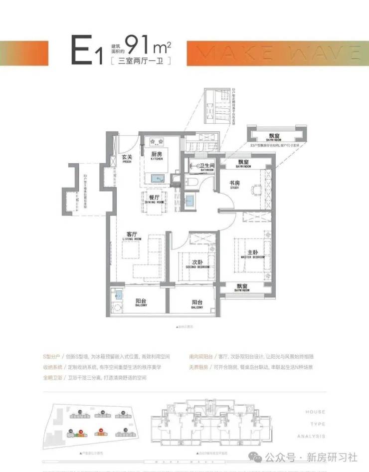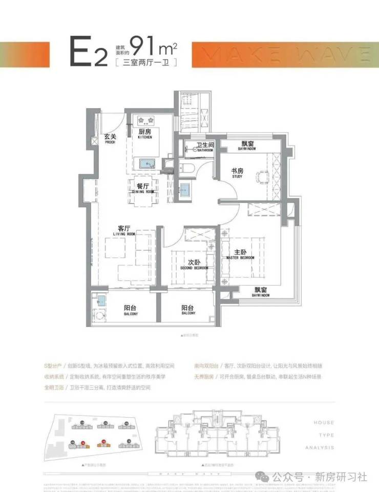 而招商·时代潮派|东屿此次建面约91㎡户型,就做出来了比市面百平户型更好的的“南向双阳台+南北双飘窗”设计。