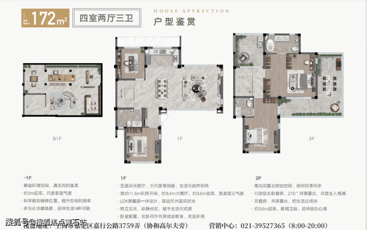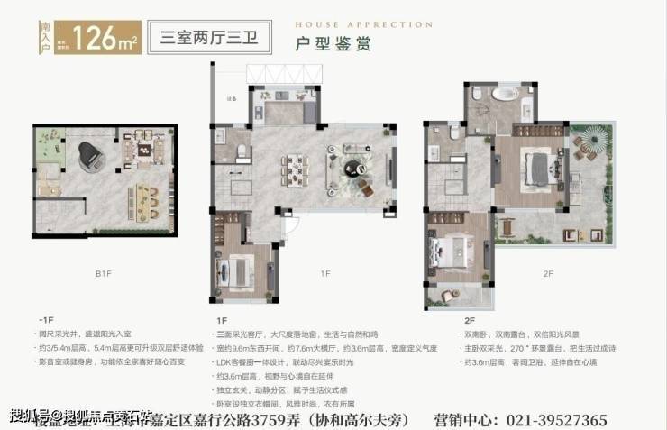 以126平别墅为例,套内可用面积约119.24㎡,赠送地下室面积74.06㎡+露台面积26.06㎡+闷顶可用面积约20㎡,实际可享受239.36㎡的套内空间+约150平的庭院面积。