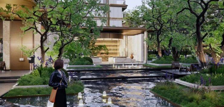 穿过摩登水院,潺潺水声过滤掉城市的喧嚣,你的心情从职场的紧绷,慢慢切换到居家的松弛;