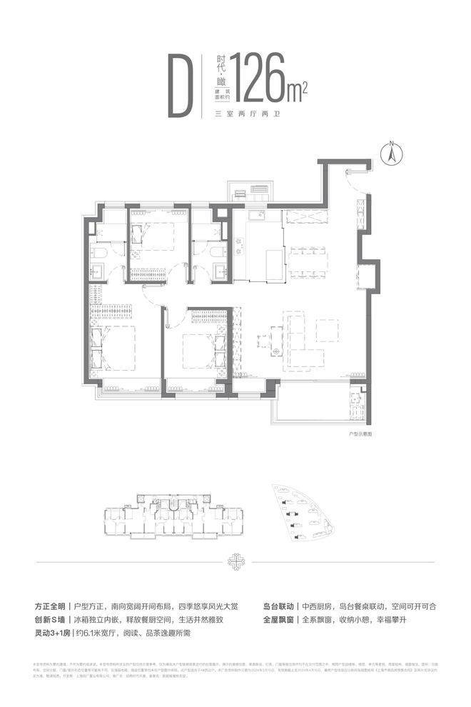 建面约126m²三房两厅两卫户型,南向3+1面宽横厅设计,让空间更加随心而变。主卧双台盆配置,用空间拥抱自然中的无限自在。