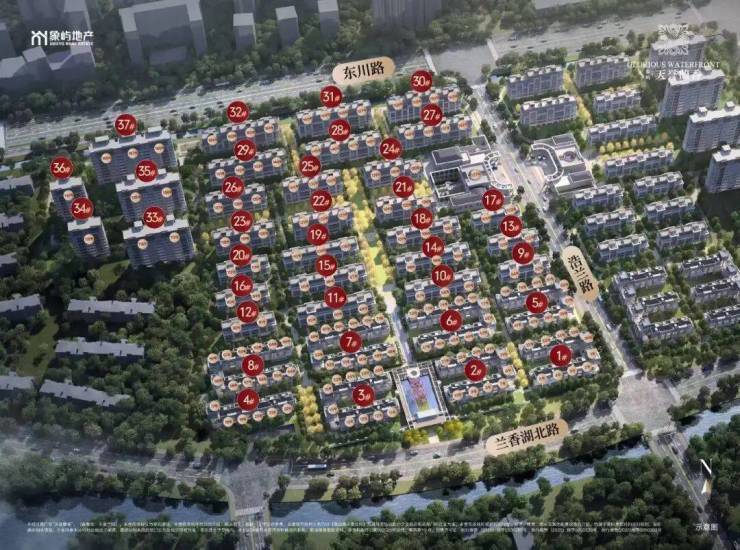 洋房分布在东西两侧,东侧洋房可俯瞰黄浦江江景及滨水绿地,西侧洋房可览兰香湖湖景。