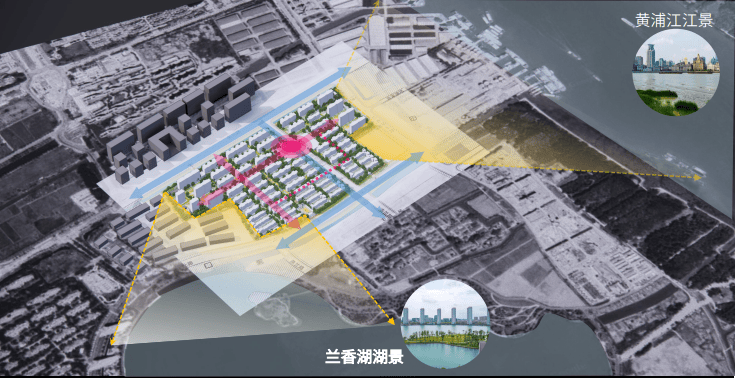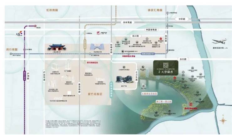 地块所在的紫竹区域占据浦江上游第一湾独特地理位置,核心区域有闵行第一大湖兰香湖,水域面积广阔,岸线绵延,湖光潋滟。