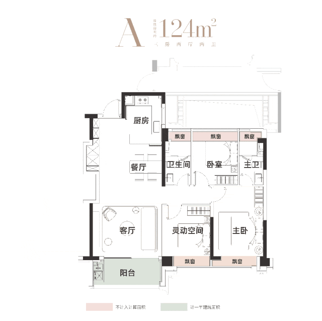 建面约124㎡三房两厅两卫,主卧与次卧共享阔尺人生。