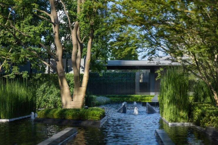 项目景观团队使用新加坡景观设计团队CICADA诗加达,采用引江入园、以水带路的手法,将滨江舒阔的国际生活平移到社区内,打造约3000方水景、6万㎡景观秘境,媲美全球奢华酒店。