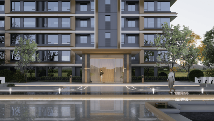 社区景观方面,项目以 "富林风华,十景多花园"为核心理念,通过现代设计语言重构《富林十景》的山水意象,将 "山、水、茶、酒、舟、市" 等江南文化符号有机融入空间序列营造 "一步一景,移步异景" 的沉浸式归家体验。