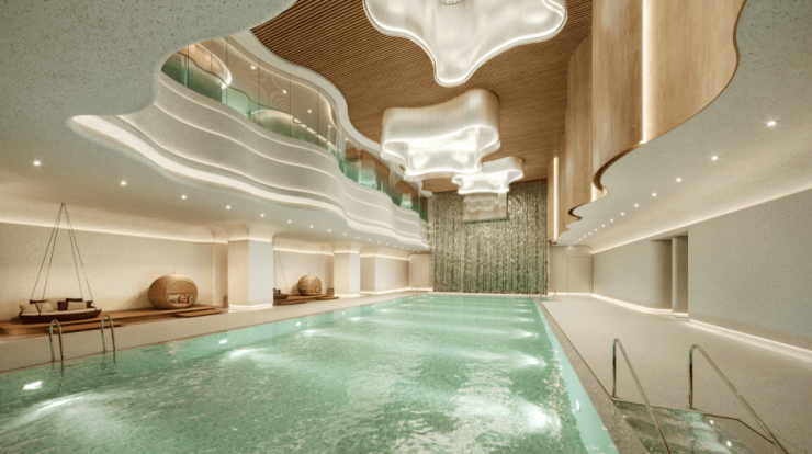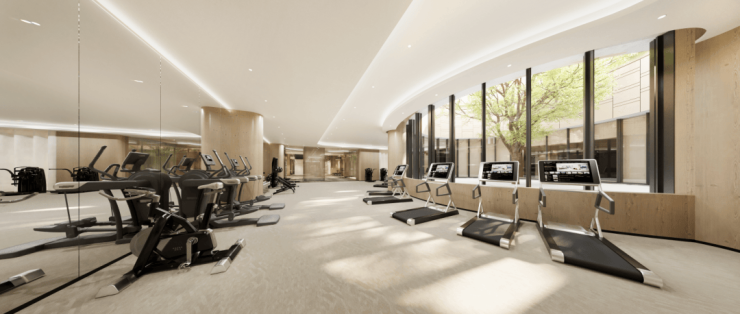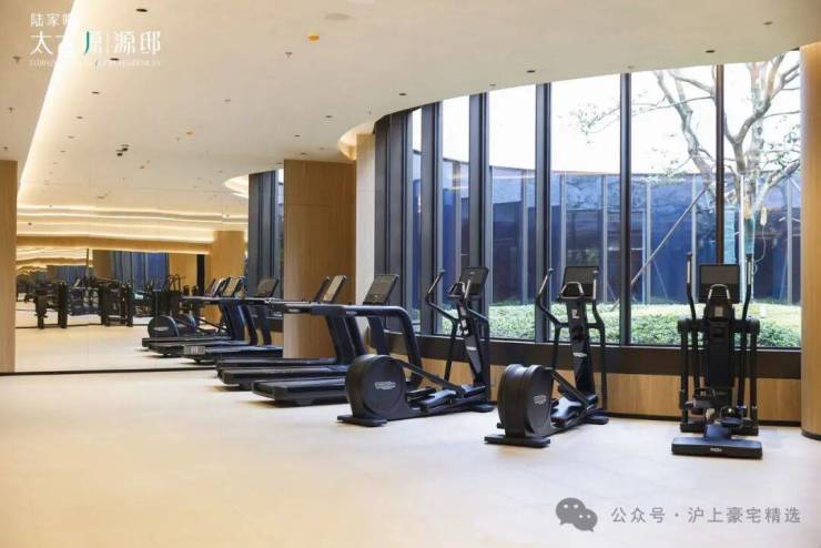两层挑高的泳池,满屏的“弧形”元素与建筑设计呼应,顶部的采光设计让阳光自然洒落,游泳时仿佛置身于“别有洞天”的艺术空间;景观健身房则采用通透设计,将室外园林景观引入室内,运动时也能与自然保持亲近。
