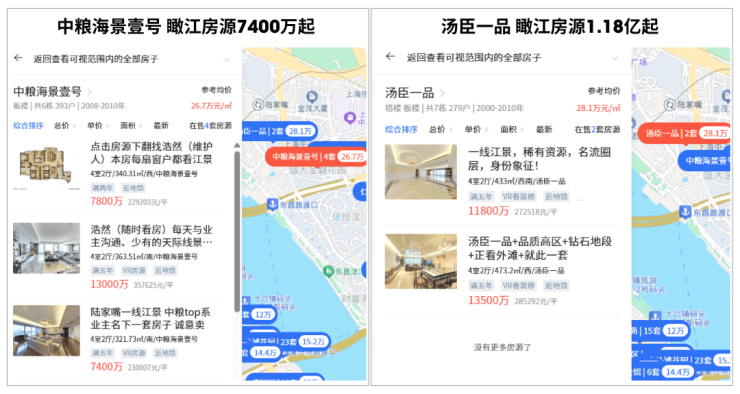 汤臣一品、中粮海景壹号二手挂牌价已达23万+/㎡,甚至30万+/㎡;九庐、陆家嘴壹号院的瞰江房源,单价也超20万/㎡。