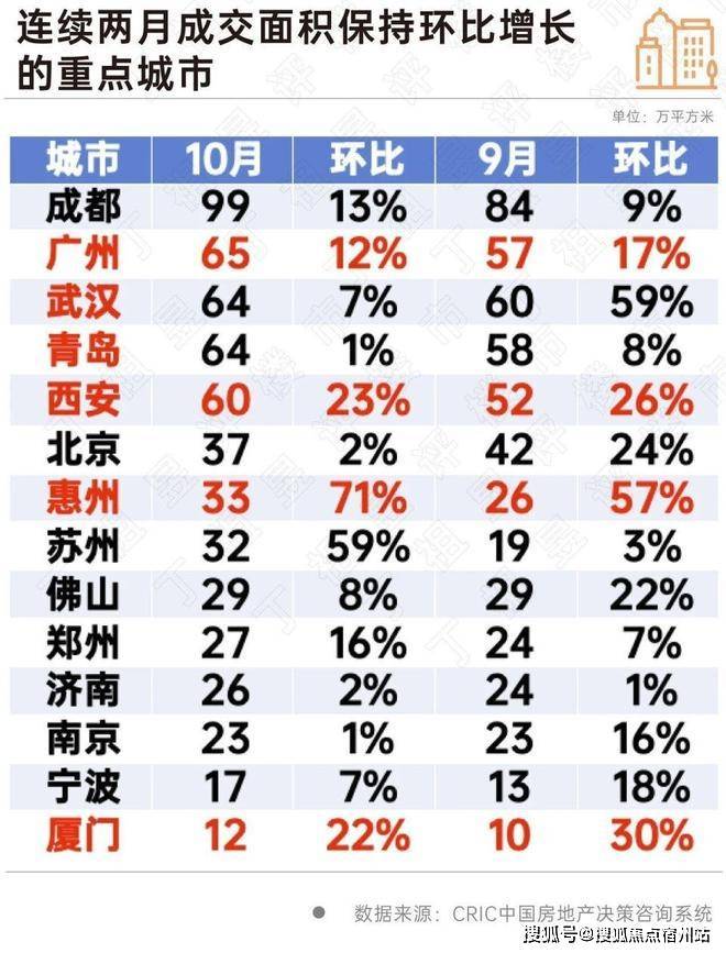 对比9月数据来看,30个重点城市中有14个城市连续两月保持环比增长,分别为成都、广州、武汉、青岛、西安、北京、惠州、苏州、佛山、郑州、济南、南京、宁波、厦门。其中,广州、西安、厦门、惠州连续两个月保持10%以上增长。