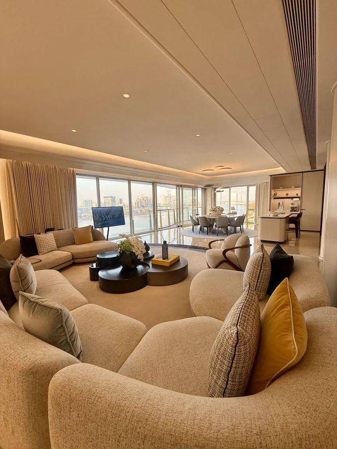 项目以全球塔尖家族的居住需求为核心,打造建面约 180-744㎡全系江景大平层,所有户型均采用大面宽、短进深、南北通透、全明无暗间设计,单层层高 3.3-3.6 米,搭配 270° 环幕瞰江视野,最大化江景景观与采光效果,得房率高达 78%-83%,精准覆盖滨江改善入门到家族终极置业的全周期需求。