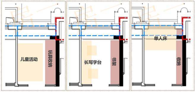 它可以是小朋友的游戏区,也可以是伴随成长的半开放书房。约2.5米的面宽,以及预留的三折叠门交标,也能独立承担单人卧室的职责。
