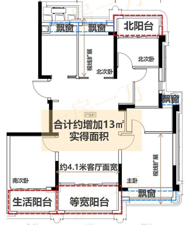 南北三阳台+满飘窗,约13㎡空间,有约140㎡同规格体验。