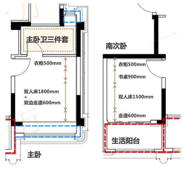 与主卧相同进深尺度,举例来看,可容纳500mm靠墙衣柜+1500mm双人床+600mm单边走道,还剩下约900mm宽度,自由布置书桌或小沙发。