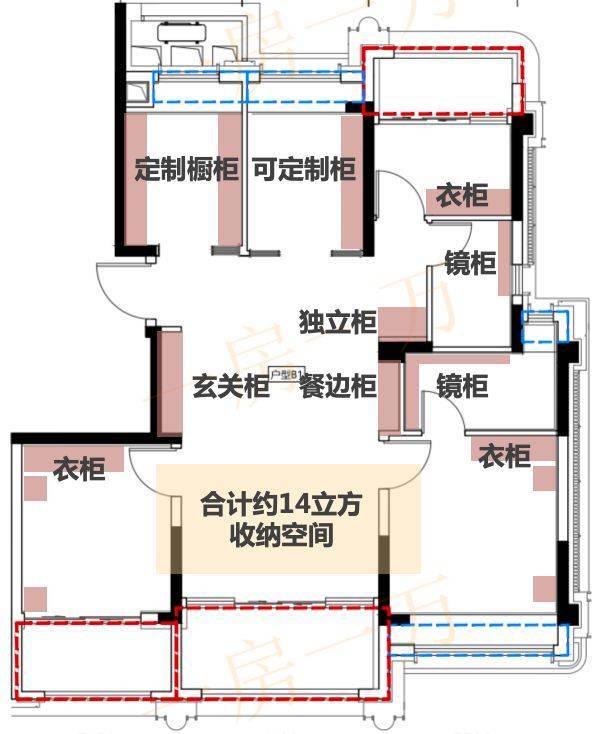 在建发海宸的这个户型中,我们细数了一下,仅根据目前的户型图推算,就能看到14立方以上的收纳容量。