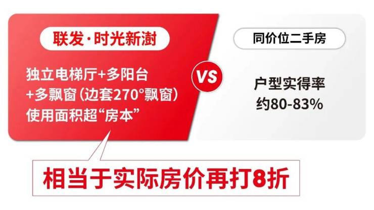 目前市面上这个价位的二手房实得率基本在80%左右,而联发·时光新澍,多阳台+多飘窗+独立电梯厅,可用面积远超“房本”,折算下来实际单价相等于再打8折!