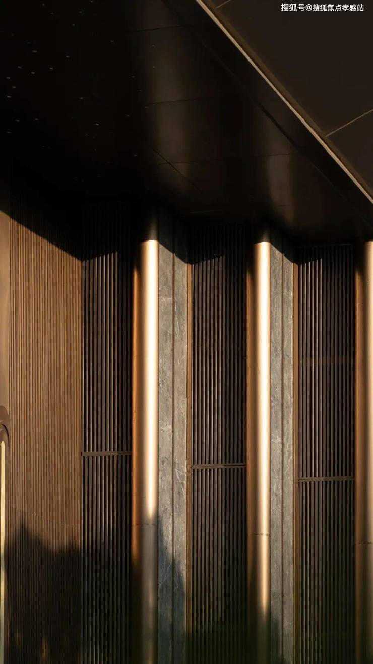 项目北区的社区归家主入口,景墙取自“水”和“鱼”的元素,诗意静谧、南区入口归家大堂,联动地下采光会所;