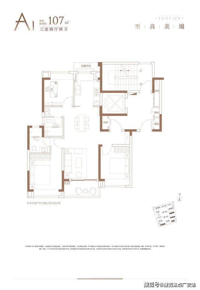 107㎡三房:采用飞机式布局,南向三开间约9.8米,U型厨房设计,得房率74-75%15。
