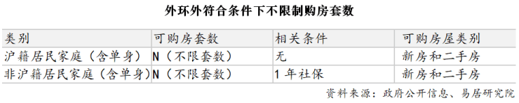 按照上述规定,沪籍居民家庭和沪籍成年单身人士,在外环外购买住房不限套数,在外环内限购2套住房;非沪籍居民家庭和非沪籍成年单身人士,自购房之日前在本市连续缴纳社会保险或个人所得税满1年及以上的,在外环外购买住房不限套数。自购房之日前在本市连续缴纳社会保险或个人所得税满3年及以上的,在外环内限购1套住房。