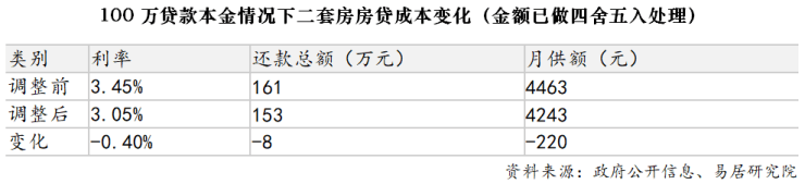 根据易居研究院测算,以100万贷款本金、30年期等额本息方式计算,还款额和月供额有明显下降。