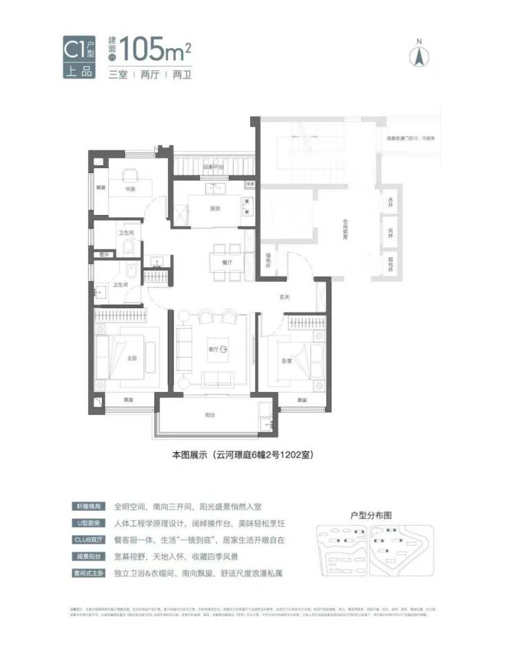 建面约105㎡3房2卫有宽厅和竖厅两种风格,其中宽厅户型好评度颇高。