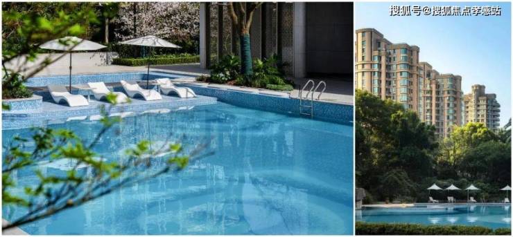 左图为绿城春晓园泳池实景图,右图为交付于2004年的上海绿城项目露天泳池实景图