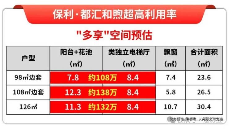 大致计算,98㎡双阳台+花池,可多享约7.8㎡,相当于送了 约52万 ;108㎡三阳台+花池,可 多 享 约12.3㎡ ,即约 82万 !