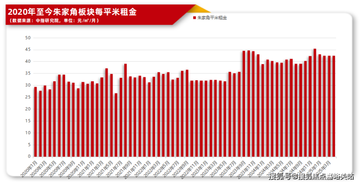根据中指研究院数据,自从2020年9月华为青浦研发中心正式开工,朱家角板块的租金就在稳步上涨,从2020年25+元/㎡左右上涨到现在40+元/㎡左右,最高的时候可以接近45元/㎡!