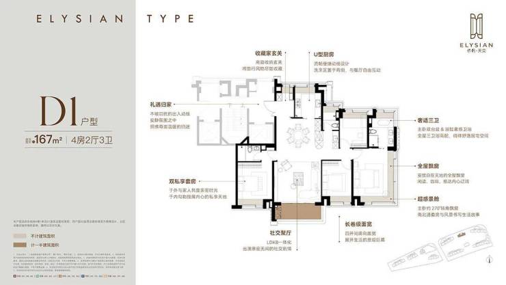 ③约270度弧面转角。重塑景观和建筑的关系,于外创造更柔和的建筑视觉效果,从内部也能打开更广角的观景视野。