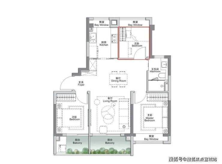 这个户型除了三开间朝南,再加上“3个飘窗+双面阳台系统”,采光通透性非常高优势之外,业主还可根据家庭结构与生活需求,灵活将空间定制为3房或者2+1房。