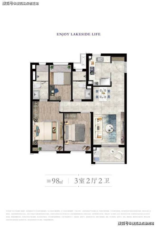 建面约98㎡3房2卫格局非常方正,每卧空间利用率高,三房都能做成卧室。南向三开间超大面宽,南北通透且全明采光,独立的餐厅空间满足家人用餐,客厅连接大阳台,室外美景一览无遗;玄关设计既保证了主人的私密性,又提升了尊贵感。