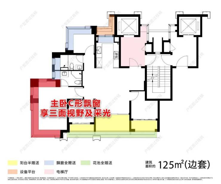 尤其是建面约126㎡边套户型,不仅南北向卧室均配置约270°转角飘窗,南向主卧飘窗更是呈C字形布局。