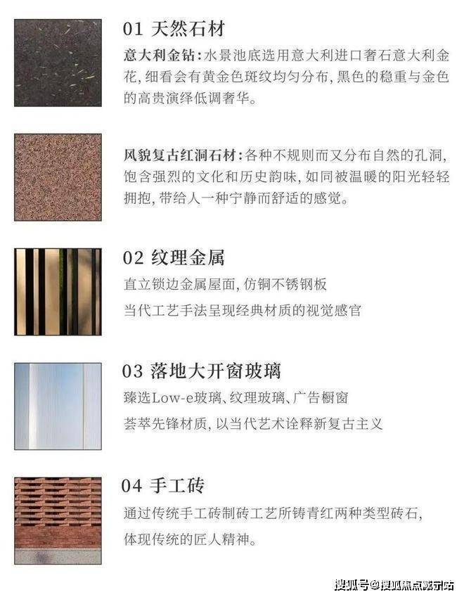 项目采用天然石材和现代工艺相结合的手法,水景池底则选用意大利进口奢石金钻,大门选用风貌复古红洞石材。