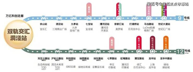 9 号线(已运营)与 12 号线(在建)洞泾站双轨交汇, 9号线4站可换乘机场联络线(已运营),11站直达徐家汇;12号线6站直达莘庄商务区,高效生活圈自此划定。