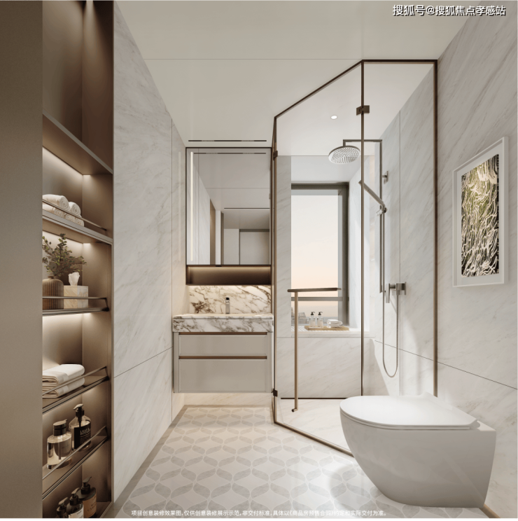 【华发海上都荟 | 云间印】售楼处预约热线:400-8855-420📲【卫浴系统】主卫恒温水阀搭配顶喷花洒,大理石防滑地砖与长条形地漏完美结合,公卫薄墙移门(不包括I户型)、淋浴区壁龛、一体式新风组合,主客卫双配智能马桶,静享高进阶卫浴系统时光。