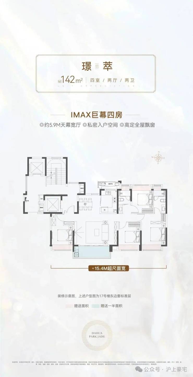 真正一步到位的改善型4房产品,大横厅的设计, 四开间朝南+大横厅,约15.4米的南向面宽堪比别墅。
