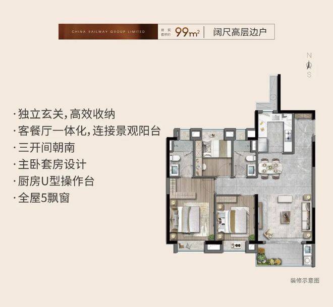 建面约99㎡洋房产品,真正的“飞机户型”,卧室分列两侧,私密性与尊崇感兼具。11F洋房的低密属性——北侧无连廊的设计,不仅进一步提升了通透性,更确保了北向卧室的私密与静谧,主卧自带独立卫浴与衣帽间,在有限面积内做出了改善级的居住体验。